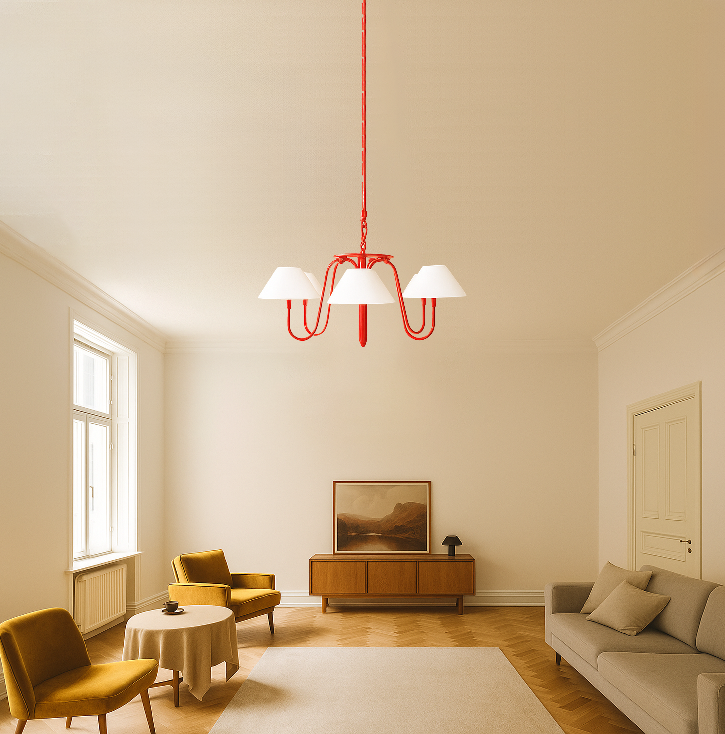 Illuminate your space with this stunning red chandelier featuring five elegant white shades. The vibrant red finish adds a bold touch to any room, while the soft white shades diffuse light beautifully, creating a warm and inviting atmosphere. Perfect for dining rooms, living areas, or entryways, this chandelier combines modern design with classic charm, making it a versatile addition to your home decor. Elevate your interior style and enjoy the perfect blend of color and light with this exquisite lighting fixture.