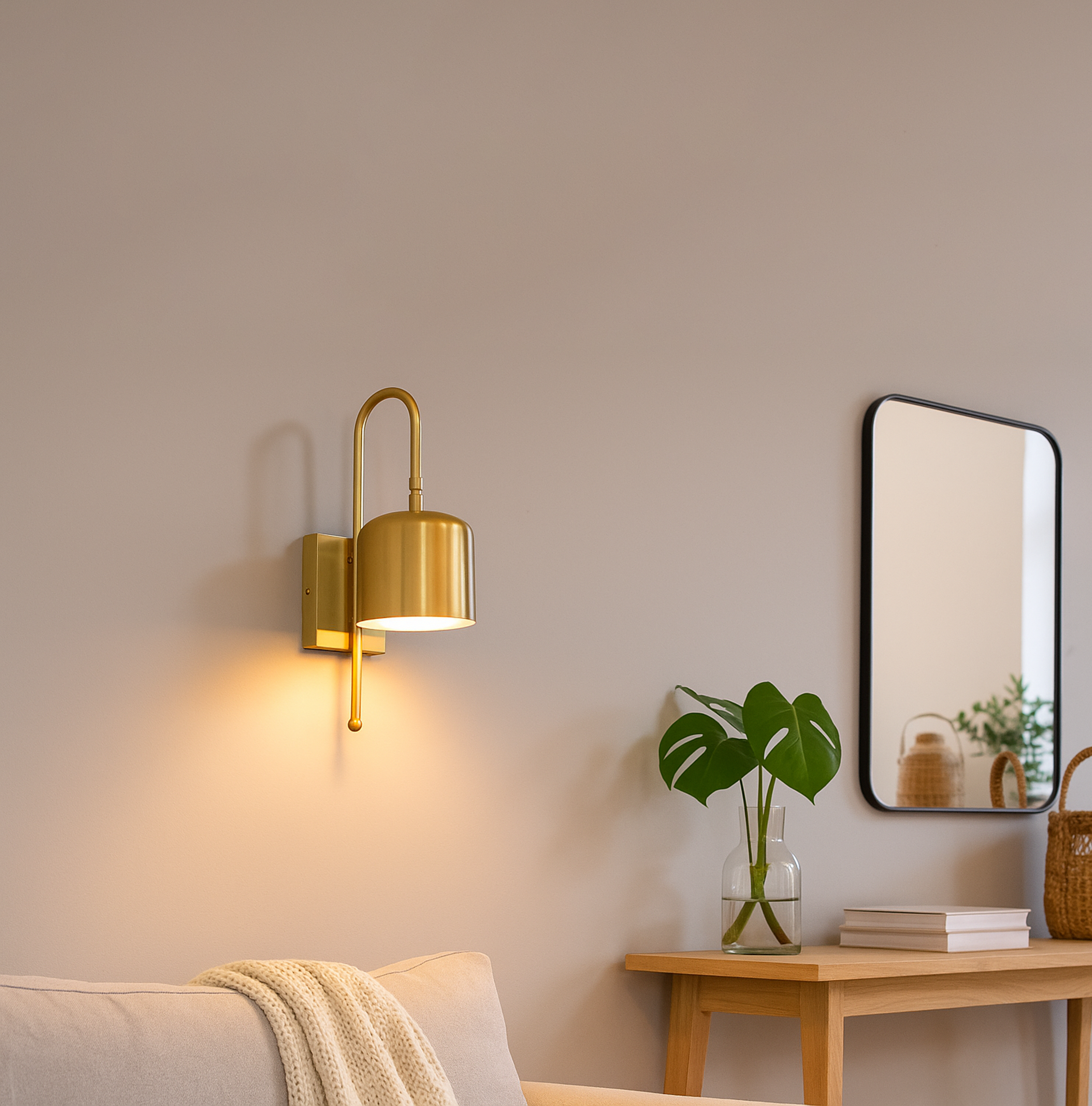 Introducing our exquisite wall lamp, a stunning addition to your home decor. With its sleek golden color finish, this lamp exudes a sense of contemporary elegance that will enhance any space. The striking design, reminiscent of a delicate one branch design, adds a touch of nature-inspired beauty to your walls. Its unique shape, gives it a charming and playful aesthetic that will surely catch the eye of your guests.