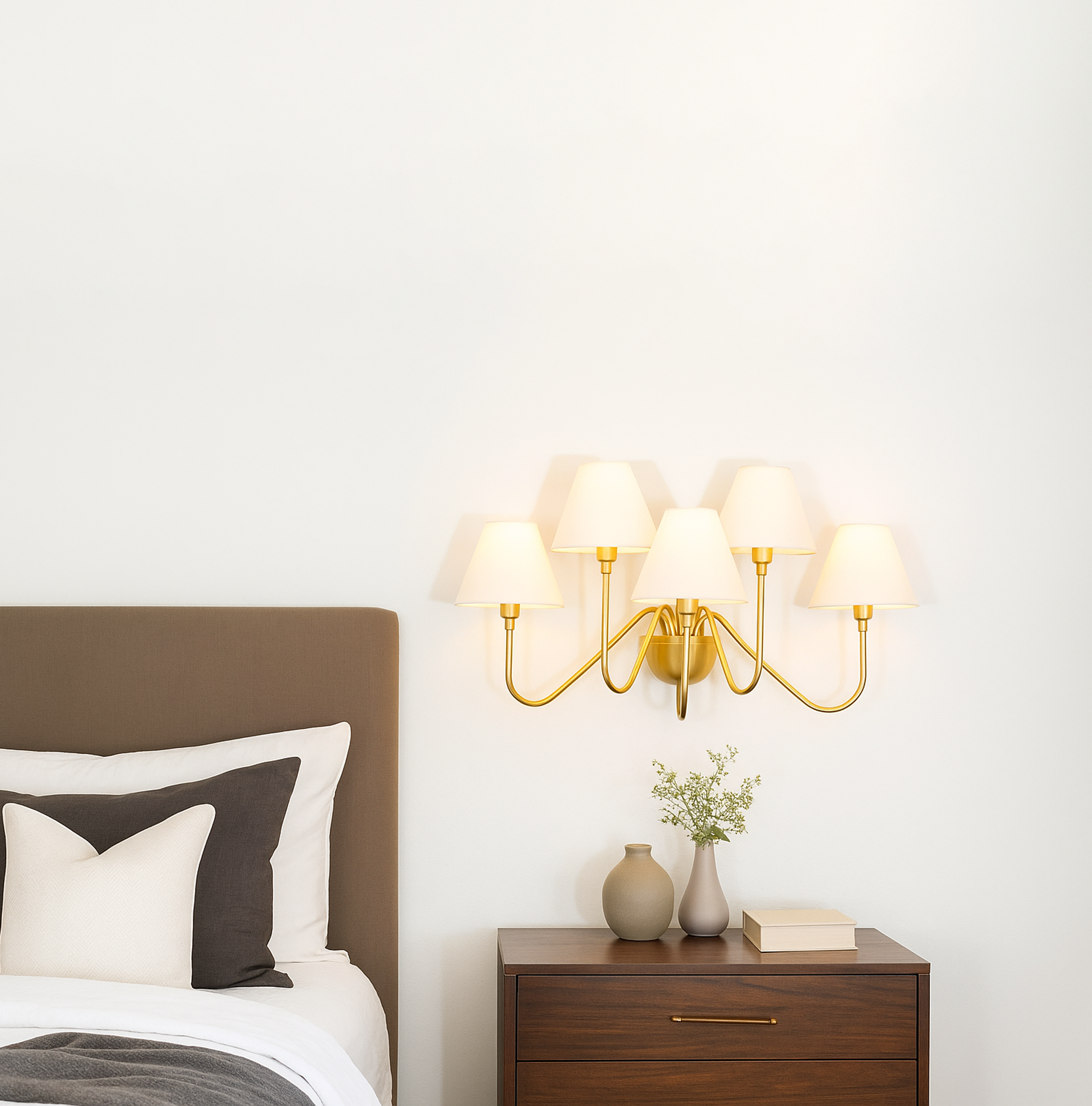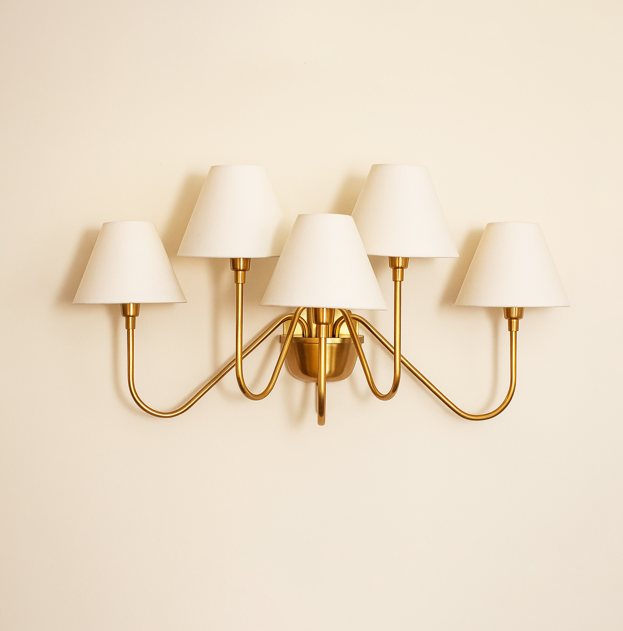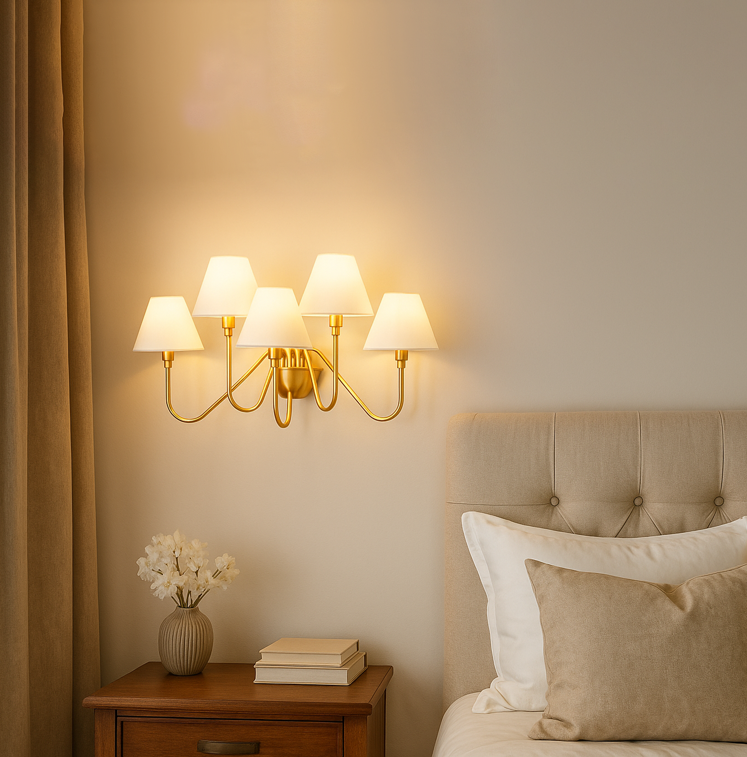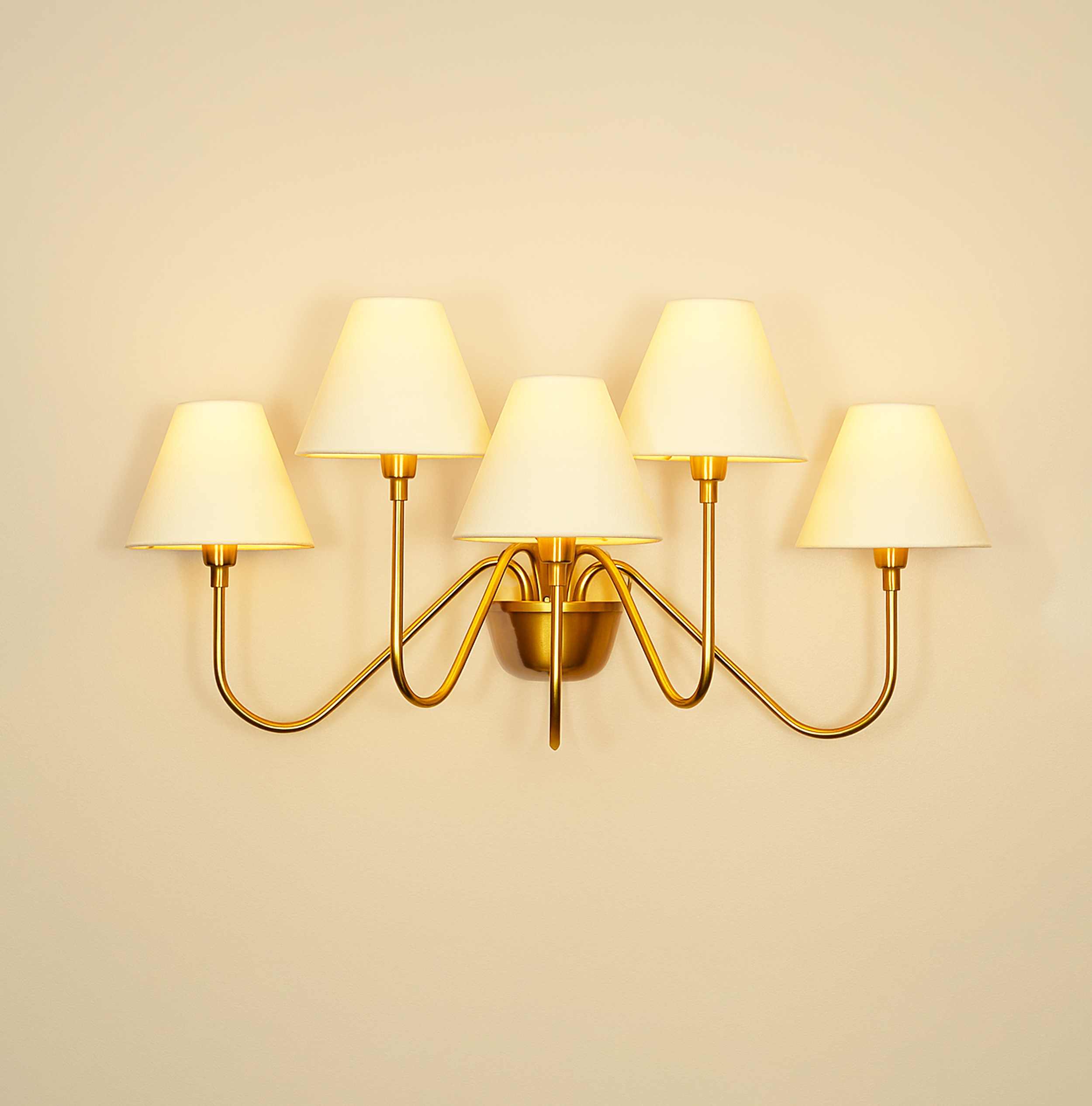 Introducing our modern gold 5 Lights Wall Lamp, a stunning addition to any space. This wall lamp combines elegance and functionality, providing both ambient and task lighting. The sleek design features five lights, creating a warm and inviting atmosphere. Crafted with attention to detail, the gold finish adds a touch of sophistication to any room. Illuminate your space with style and grace with our modern gold wall lamp.