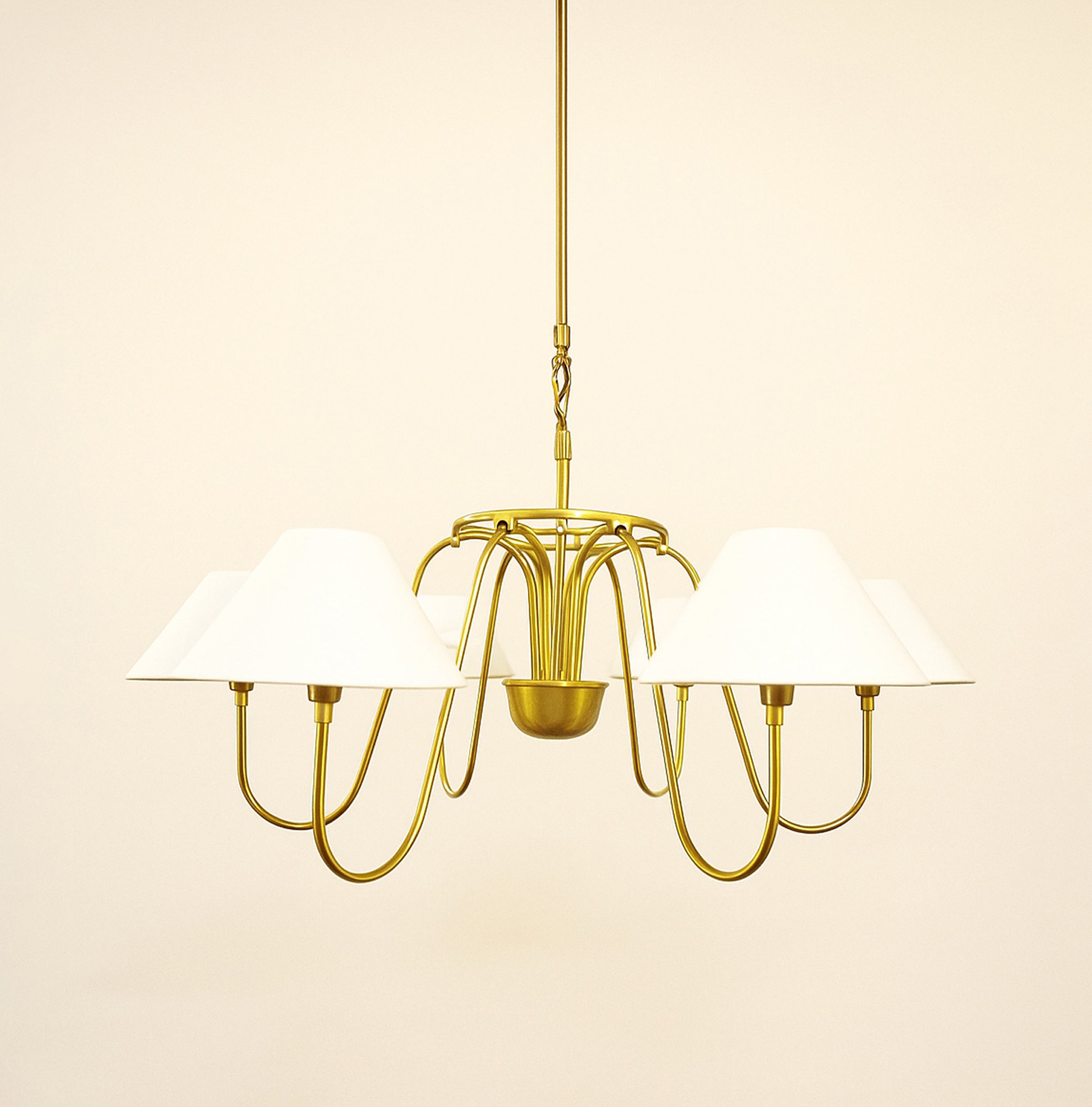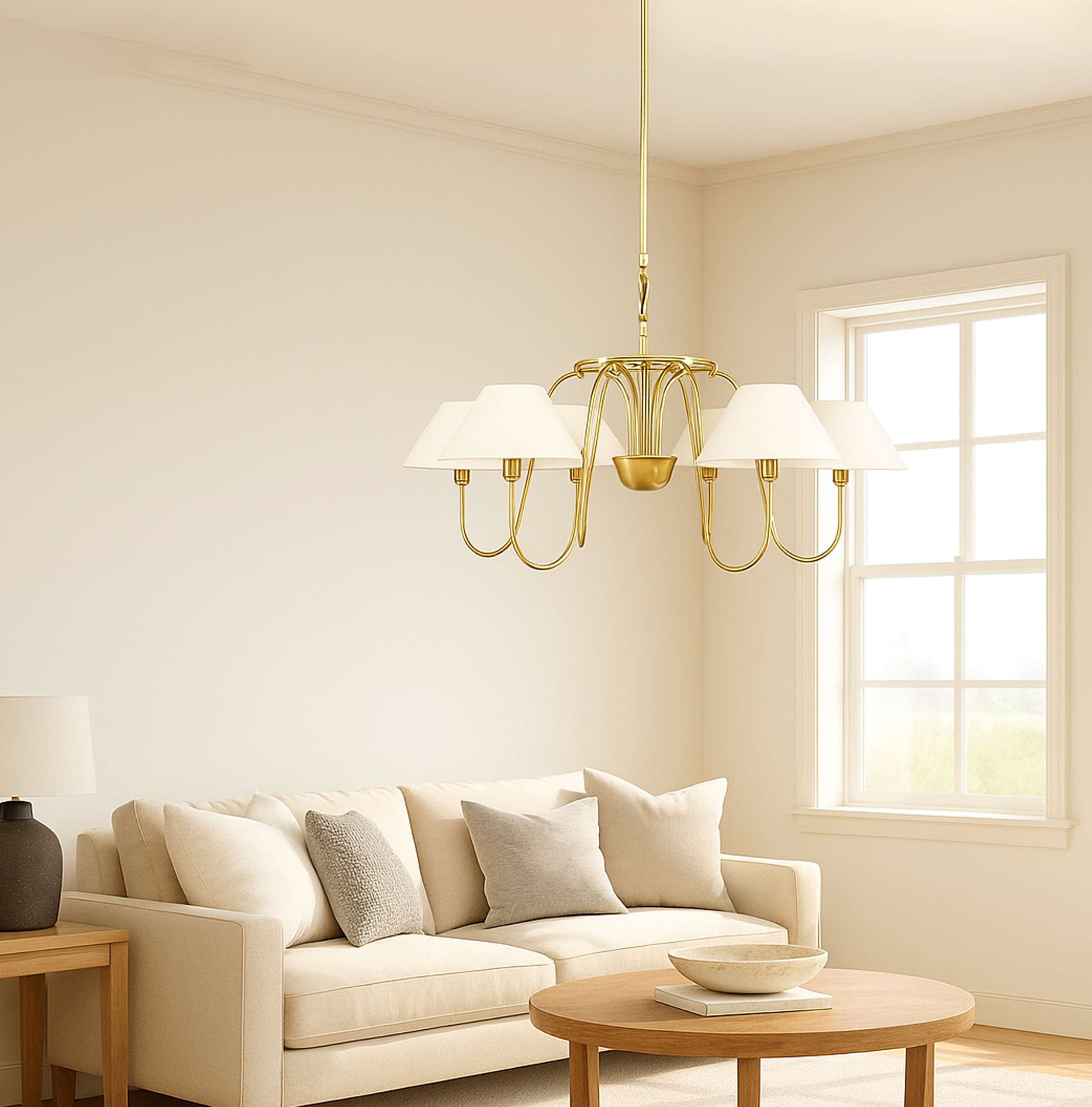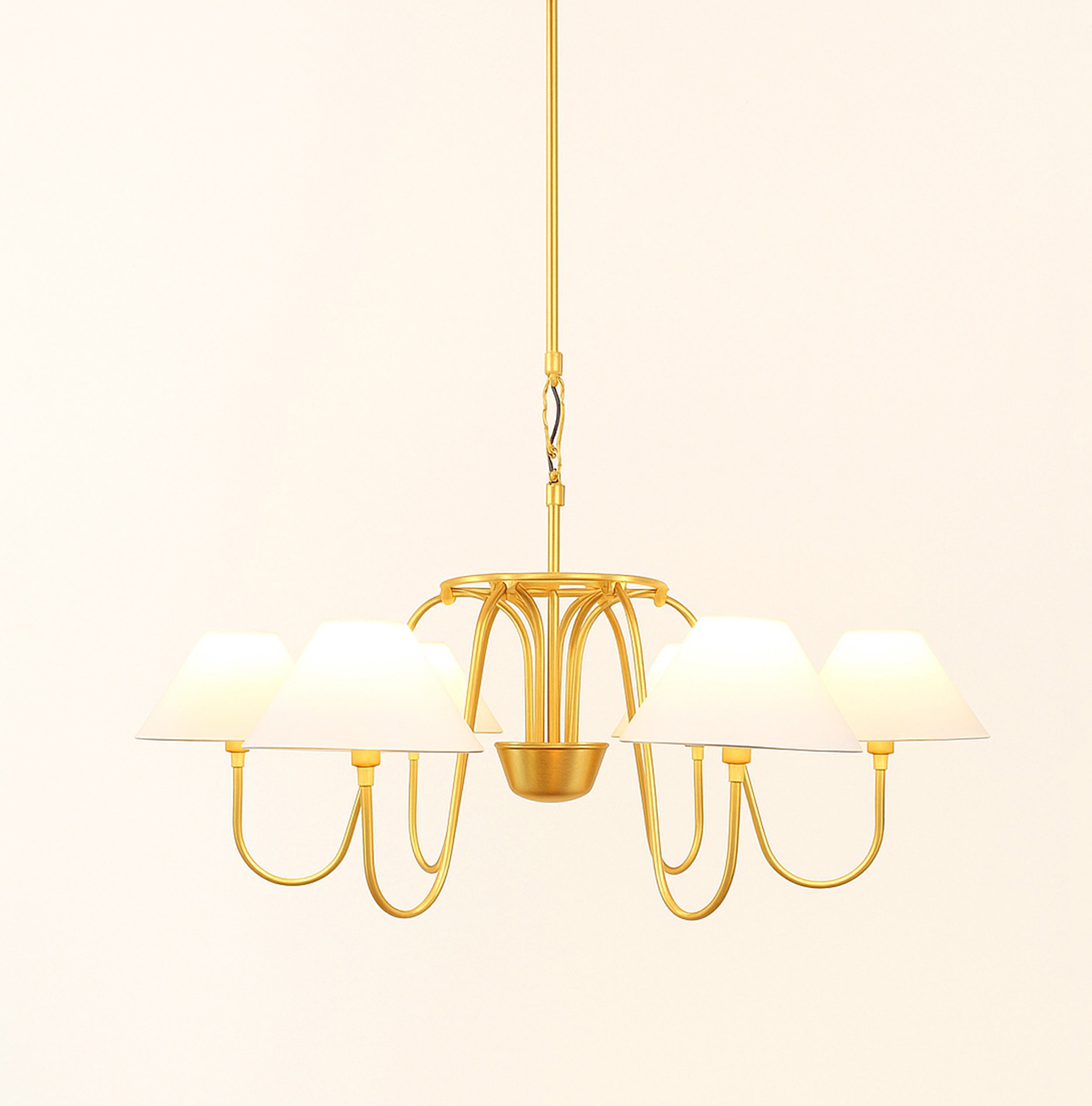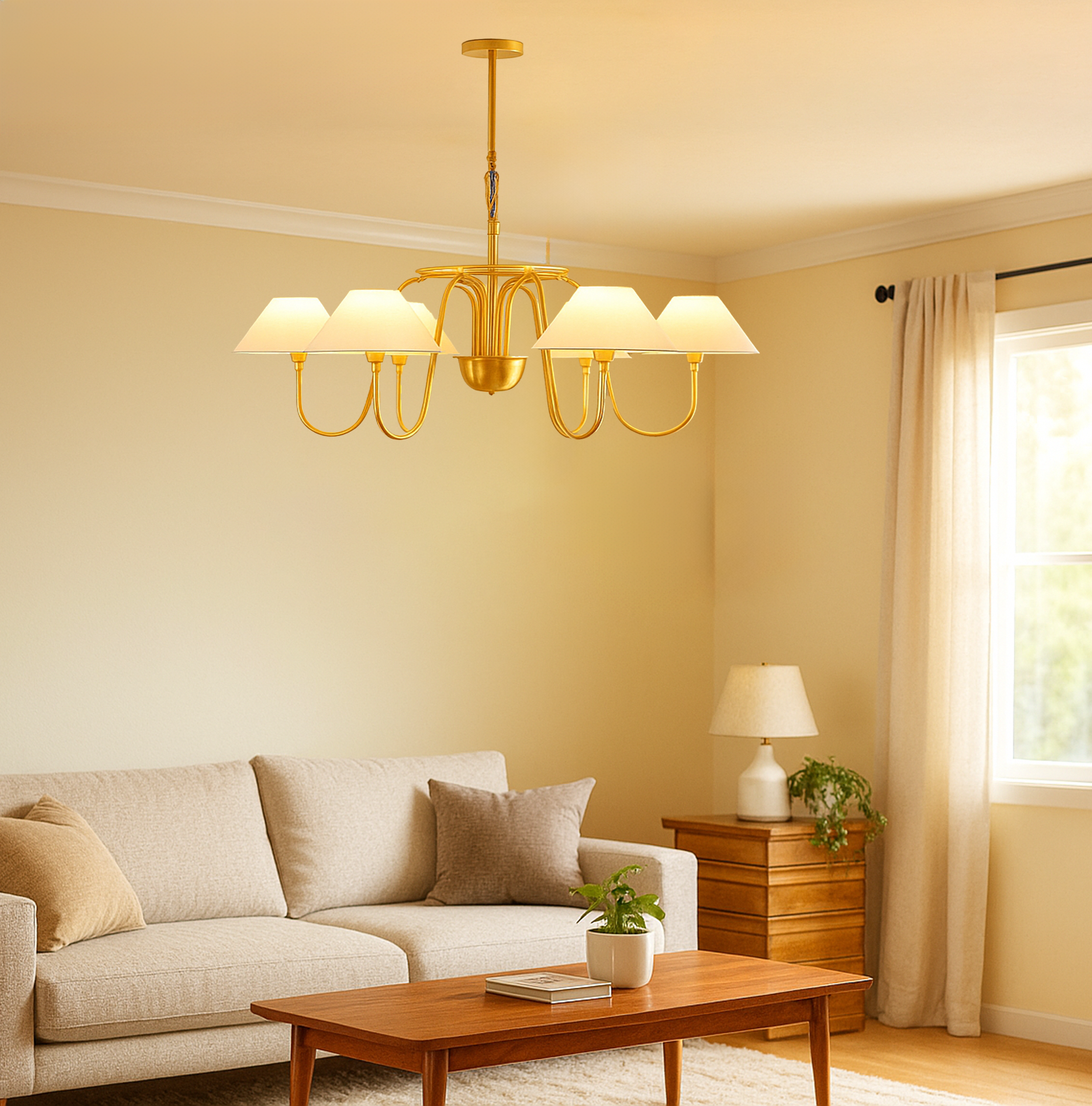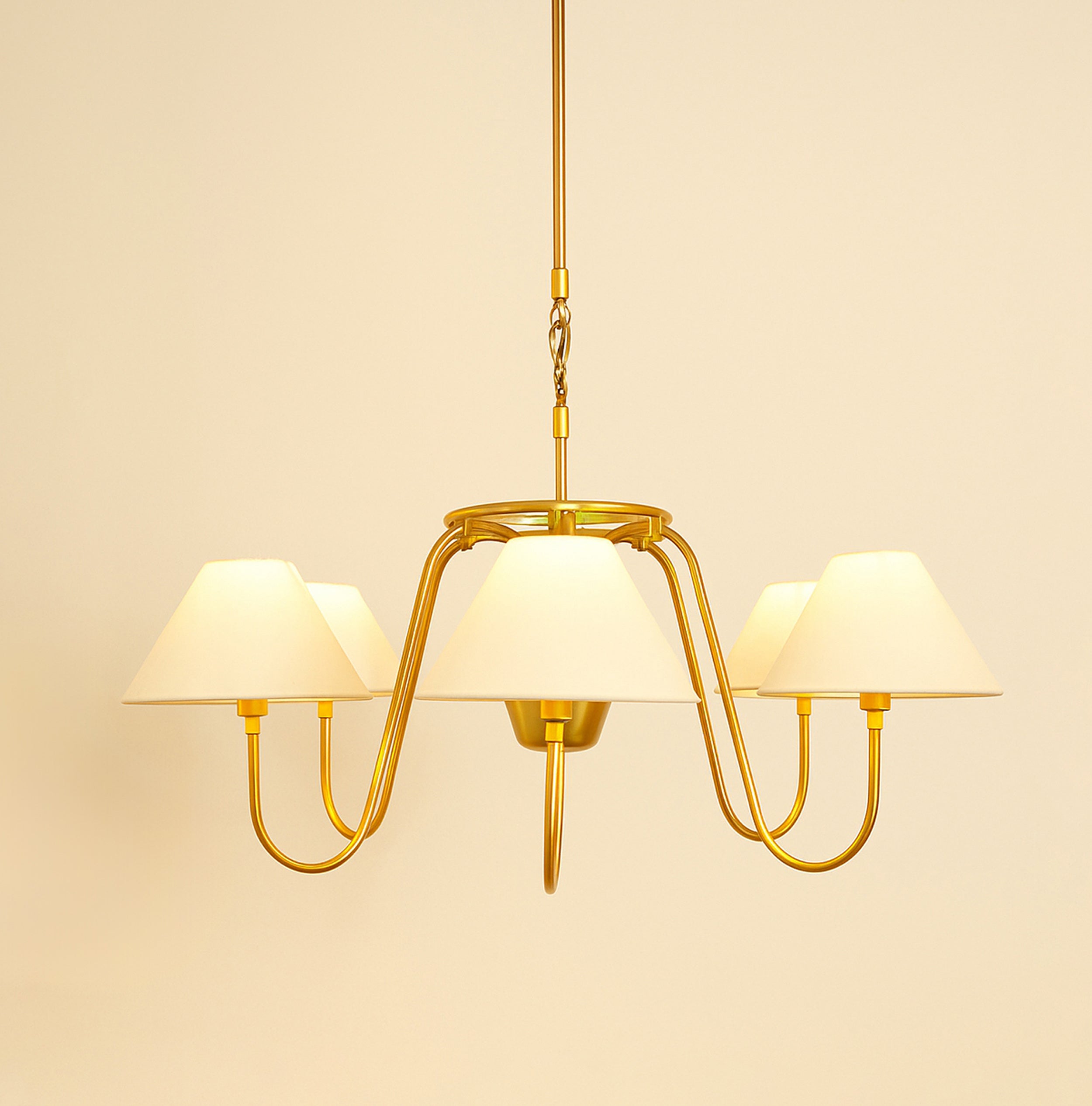 Illuminate your space with this stunning Golden chandelier featuring five elegant white shades. The vibrant red finish adds a bold touch to any room, while the soft white shades diffuse light beautifully, creating a warm and inviting atmosphere. Perfect for dining rooms, living areas, or entryways, this chandelier combines modern design with classic charm, making it a versatile addition to your home decor. Elevate your interior style and enjoy the perfect blend of color and light with this exquisite lighting fixture.